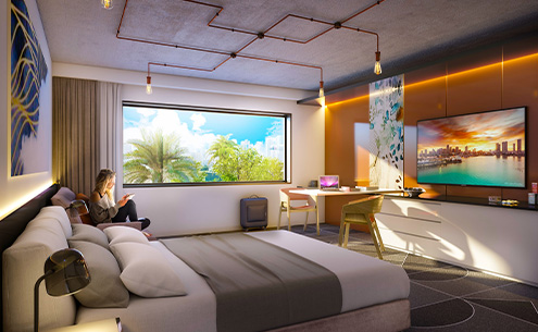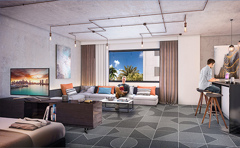 El proyecto está dirigido a pasajeros de estadía prolongada, por lo cual la amplitud y terminación de sus habitaciones contemplan todo el equipamiento necesario para su comodidad. El diseño del edificio acompaña la dinámica y la arquitectura de la zona, en donde el estilo industrial y los colores son preponderantes.