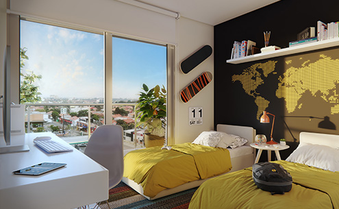 Con sumo respeto con la escala barrial, maximizando la liviandad con su diseño y recreando la presencia de la vegetación como parte de su imagen, se erige con fachadas hacia el frente y contrafrente descubriendo en sus visuales su entorno completo prestando atención a la belleza del sitio. Diseñado en 2 volúmenes delgados mirando hacia el frente e interior de su manzana, todos sus departamentos gozan del privilegio como espectadores de lujo de la frescura de la amplitud que existe hacia ambos lados. Esta amplitud se mantiene con vida en el interior del edificio por sus grandes vacíos confirmando el carácter de cada elemento arquitectónico del edificio.