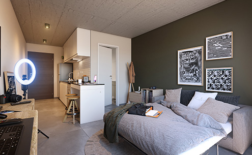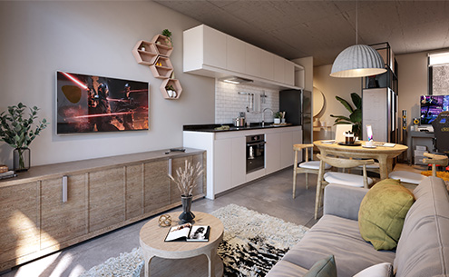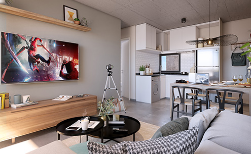 * 72 unidades entre monoambientes, departamentos de 1 dormitorio y departamentos de 2 dormitorios.