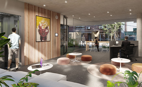La planta baja contiene el hall con un área de cowork interior. Además se destaca con una bicisenda que recorre un jardín frontal y jardines internos con espacios de bike parking y áreas de encuentro destinados para estar, disfrutar, leer o trabajar.
